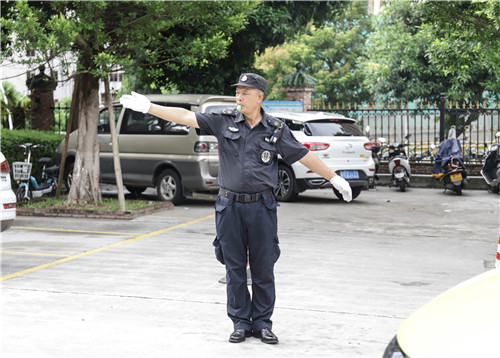 身着黑色警卫服的安保人员在各个交通点、人流量大的地点进行引路、维持现场秩序,并安排人员在校园巡逻应对急事,确保校园秩序井然。