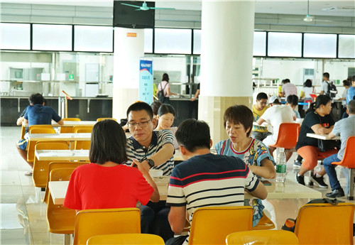 厨师们在闷热的备餐间内用火烹调出一道道美味的菜品,迎接近6000名新生及家长。来自全国各地的新生及家长都迫不及待想尝尝食堂的菜品,纷纷拿出校园一卡通刷上大学“第一餐”。校园四大餐厅现场设置展架、图片、标语等提示新生和家长用餐事项。