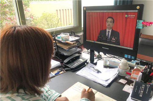 总理的报告既接地气,又鼓士气。党员同志们一边观看直播,一边在学习本上做好记录。会后,大家纷纷表示深受感染,要进一步加强学习、思考与创新,将“两会”精神与后勤工作结合起来,把师生关注的热点与党建工作结合起来,根据疫情防控需要扎实做好本职工作,为学校发展与师生保障做出应有贡献。(李茜)