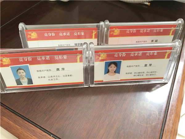 集团全体党员“亮身份、亮承诺、亮形象”,进一步引导党员增强党性意识、责任意识、服务意识、奉献意识和宗旨意识,不断保持和发展党员队伍的先进性和纯洁性。戴党徽“亮身份”,要求党员工作时、开展党员志愿服务时都要佩戴好党徽,通过戴党徽的方式,引导党员主动亮明身份,接受群众监督,约束自身言行,增强发挥先锋模范作用的行动自觉。一句话“亮承诺”,每位党员同志书写一句自己的真挚承诺,在工作、生活、学习中不断践行初心使命,提高服务师生的效率。摆标识“亮形象”,每位党员同志办公桌上都摆放“党员标识牌”,时刻提醒自己要从文明用语、礼貌待人等细节入手,树立良好形象。