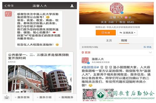 时刻关注舆情,通过集团网站、官方微博帐号、微信公众帐号发布后勤集团新闻与后勤服务相关信息;微信公众帐号提供后勤服务信息自动查询功能;注重与师生网上互动,提升后勤集团“温馨人大”的品牌效应。