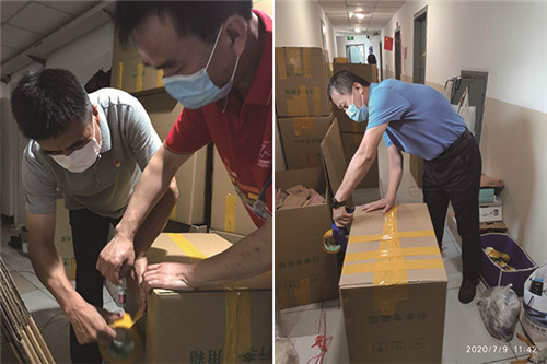 7月5日开始,支部全体党员化身“打包员”、“搬运工”,配合学院老师收拾整理学生的行李物品,按类别包装、封箱、称重、搬运。逐一核对学院信息单、邮寄单上学号、姓名、地址等信息,确保信息准确无误。炎炎夏日,党员们汗流浃背、连日奋战,没有一名党员喊累,没有一名党员退缩。