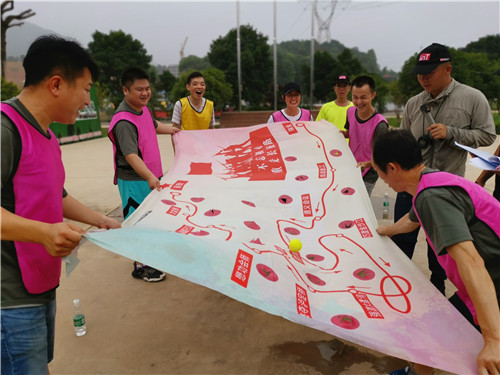 上午八点,第一个项目“决战沙场”开始。共分为三个队伍,各队“士兵”在指挥官指挥下,绕过“地雷”,拿起“炸弹”,消灭敌方。此项目让队员领会到服从组织、团结协作、令行禁止的团队文化和精神。第二个项目“重走红军路”,几个队员合作,拉起一张不到一个平方的地图,让小球沿着指定的长征路线在地图上滚动,直至小球成功抵达终点。这个项目让队员在地图上体验红军血战湘江、飞夺泸定桥、翻雪山、过草地,最终抵达革命圣地延安,再现了红军长征的辉煌历史。第三个项目叠军被比赛,学生宿舍管理中心的张征和生活服务中心的陈可嘉分别获得小组第一。第四个项目为“CS刺激战场夺旗战”,向军副部长兴致勃勃地加入战斗,他敏捷地越过障碍物,准备夺旗,但因很多同志早就瞄准了他,没多久就身中“数弹”退出战斗,他自嘲道“同事们都明白擒贼先擒王的道理!”逗得大伙开怀大笑。