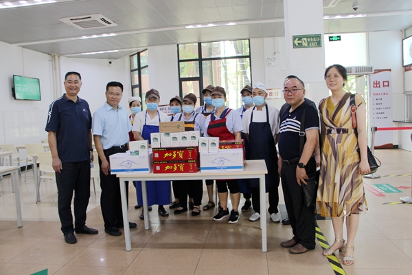 王清远询问了食堂的暑期工作情况,肯定值班员工们不惧暑热,认真做好防疫和餐饮各项工作。并代表学校对员工们的辛勤劳动表示感谢。还亲切嘱托员工们,在高质量做好工作的同时,一定要做好防暑工作,注意身体健康。随后,向员工们分发了加多宝、茶等消暑饮品。值班员工满面笑容,与王校长握手言谢,表示将不负嘱托,以健康的身体,保质保量做好防疫和餐饮服务工作。