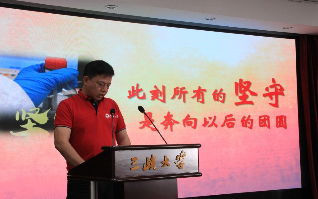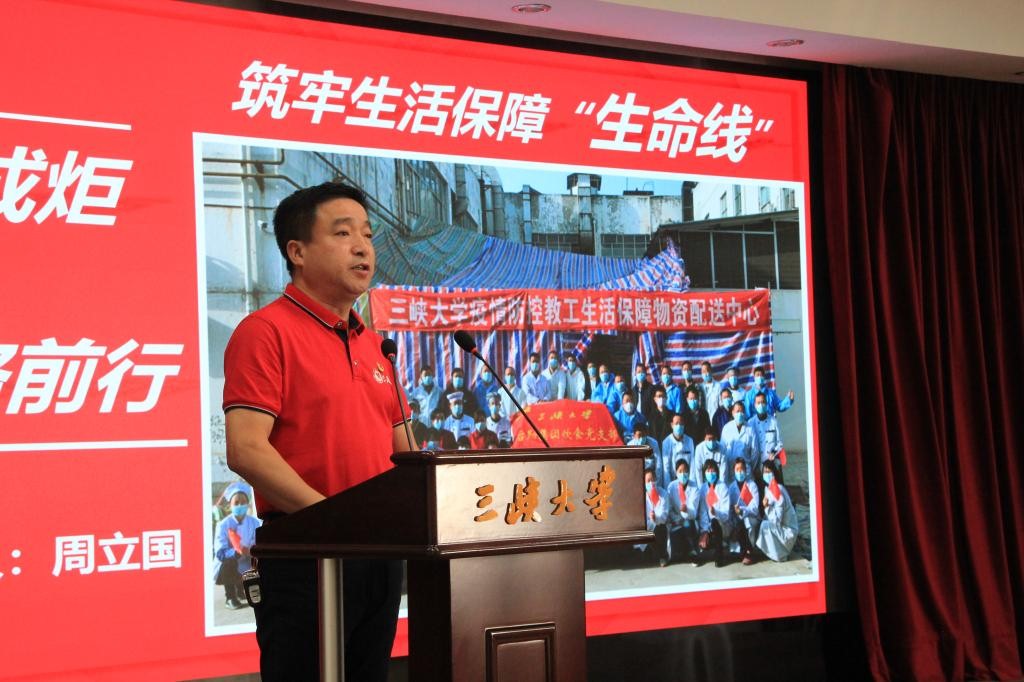 宣讲会前,三峡大学后勤集团党委书记王国芳发表热情洋溢的讲话,回顾了在抗疫和抗洪斗争中,全体后勤人主动请战的担当精神、勇往直前的牺牲精神、不计得失的奉献精神、众志成城的团结精神。他认为,后勤所形成的抗疫精神和抗洪精神,是伟大的、宝贵的和值得弘扬的。