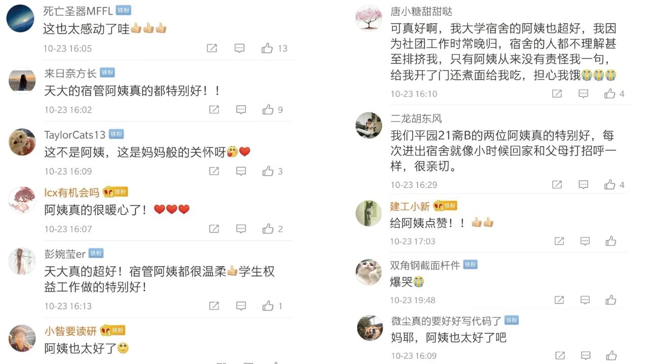 主动、热情、诚信、善良的田爱芝赢得了学生的心,天津大学专门对此做了报道,称她为“最美宿管阿姨”。在评论区,学生们也都纷纷赞叹,争先分享自己与“田妈妈”的故事。