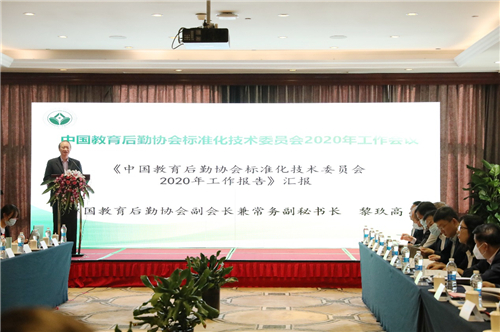 会上,副会长兼常务副秘书长黎玖高代表标委会作《中国教育后勤协会标准化技术委员会2020年工作报告》。报告指出,标委会成立以来,按照国家对团体标准管理的要求,以规范运作为原则,不断加强组织制度建设;以提升质量为核心、研究制定团体标准,目前协会已经出台了T/JYHQ 0001-2016《校园快递服务站建设与服务规范》、T/JYHQ 0002-2019《高等学校引入社会餐饮企业承办学生食堂管理规范》、T/JYHQ 0003-2019《高等学校学生公寓管理服务规范》、T/JYHQ 0006-2020《高等学校后勤组织文化建设评价标准》、按照国家标准化委员会鼓励协会之间合作制定发布标准的政策导向,标委会以整合资源为手段,促进联合出台标准,与中国水利学会联合颁布了《节水型高校评价标准》和《高校合同节水项目实施导则》两项团体标准。目前,正在与中国物业管理协会合作开展《高等学校物业服务规范》团体标准的研制工作。以标准落地为目标,积极开展宣传培训活动。