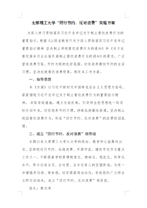习近平总书记历来高度重视粮食安全和提倡“厉行节约、反对浪费”的社会风尚,多次强调要制止餐饮浪费行为。学校紧紧围绕习近平总书记关于制止餐饮浪费行为的重要指示精神,从办学的政治、教育和公益属性出发,提高政治站位,认真抓好落实,制定了《太原理工大学“厉行节约、反对浪费”实施方案》,成立了校长领导下,多部门协同联动的“厉行节约、反对浪费”领导小组,坚持把“厉行节约、反对浪费”作为重点工作,不断提高学校管理制度化、精细化、规范化、科学化水平,努力打造全员、全过程、全方位育人的坚强阵地。