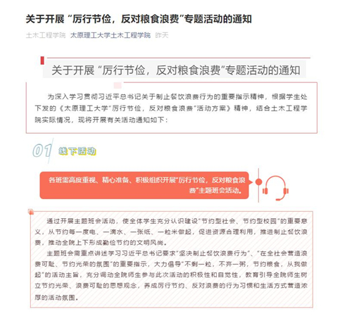 组织学生以“普及日常文明知识,使得节俭之风盛行”和“倡导餐桌光盘行动,养成良好生活习惯”为主题,利用“线上”和“线下”相结合的方式,组织学生开展“厉行节俭、反对粮食浪费”主题班会活动,以班级为单位推送学校“厉行勤俭节约,反对粮食浪费”倡议书,组织学院学生签署倡议书,同时倡导各学院组织开展“光盘打卡”主题系列活动。