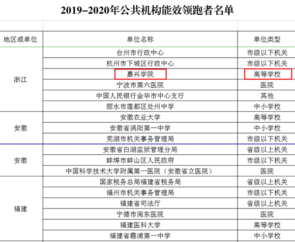 12月17日,国家机关事务管理局、国家发展改革委、财政部联合印发了《关于公布2019-2020年节约型公共机构示范单位和能效领跑者名单的通知》(国管节能〔2020〕400号),嘉兴学院荣获全国“公共机构能效领跑者”称号。