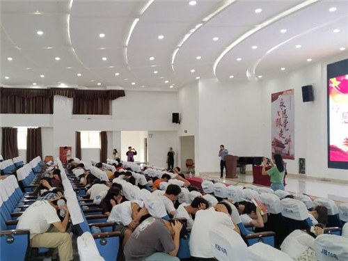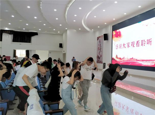 最后,肖铭祥细讲解了地震发生时需注意的事项及逃生方法,并模拟学院发生地震,办公楼剧烈摇晃,与会师生就地寻找“活命三角区”,采用安全姿势避险并按照既定路线疏散逃生。