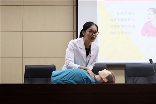赵栋苗系统地讲解了在发生各类意外伤害或突发疾病、医务人员未抵达现场时,如何在第一时间给予正确的现场紧急施救;通过理论讲解与专业人体模型演示对“海氏法”解除气道梗阻、心肺复苏术重点培训,并邀请参训员工进行实际操作演练。