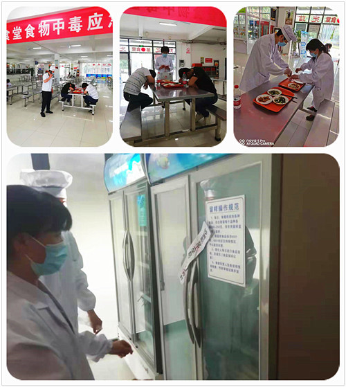 本次演练全程模拟突发食品中毒应急流程。模拟了两名“学生”在用餐时,突然出现腹疼、呕吐现象,现场保洁员发现后,立即逐级上报,后勤保卫处接到报告,通知医务人员共同赶赴现场确认情况,启动食品中毒应急预案,在通知120的同时,由保卫科安排保安人员封存通道,维持秩序,食堂卫生监督员紧急封存留样食品和餐具等待调查,后勤保卫处现场负责人向学院领导汇报情况。