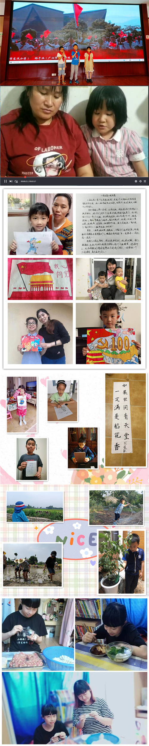 今年正值中国共产党成立100周年。一百年来,中国共产党初心不改、矢志不渝,团结带领中国人民历经千难万险,攻克了一个又一个难关。而儿童作为祖国的花朵和未来,更需要认识、了解党的知识。员工家长带领孩子们用绘画、手工、唱歌、跳舞、朗诵等各种形式向中国共产党成立100周年献礼,一首首动听的歌、一副副童趣的图画、一件件创意的手工、一个个精彩的视频汇聚在一起,表达着给孩子们对党、对祖国的爱。
