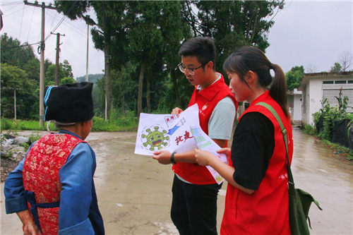 中国青年网7月22日电(通讯员:陈家宇)7月22日,贵州大学科技学院“三下乡”暑期社会实践团理论宣讲队在雅水镇大龙村开展理论宣讲入户活动。20位实践团成员结合大龙村实际情况,采取挨家挨户上门宣讲,“摆龙门阵”,分发海报、宣传册,播放宣传视频等接地气的形式,与村民聚坐一堂,用简洁明了的语言、视频向群众解说“七一精神”、“珍爱生命,远离毒品”等理论知识,细致地向村民讲解疫情防控措施、乡村振兴政策等内容的要义。