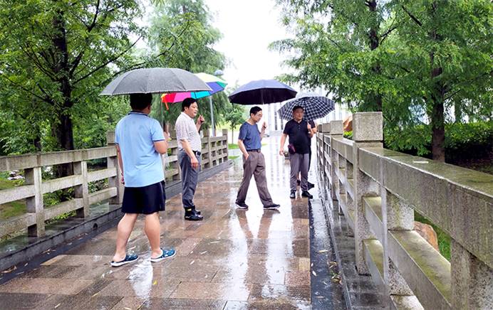 陈桂林一行先后来到会峰校区会峰湖、实训1号楼工地、信息中心机房、地下车库和琅琊校区东苑等防汛重点部位,对泄洪闸、排水通道、高空坠物隐患、防汛物资等进行了检查,详细了解安全排查、人员值守、应急预案等防汛准备工作情况及存在的困难,并对做好台风防御及汛期安全工作提出要求。