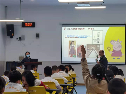 2021年10月21日下午,青岛市教育后勤保障服务中心、市纤维纺织品检验研究院、青岛市南区教体局在青岛市宁德路小学联合开展“守护安全 快乐成长——百年献礼 启航新征程”进校园服务活动。
