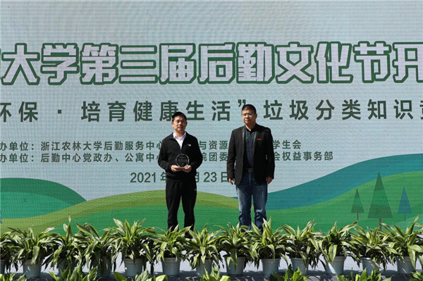10月23日上午,浙江农林大学第三届后勤文化节开幕式暨“倡导绿色环保•培育健康生活”垃圾分类知识竞赛活动在东湖食堂广场举行。校党委副书记施美红,副校长胡祖吉,校党委委员、宣传部部长倪建均,学工部、公管处、校工会、校团委、环资学院及校学生会等负责人出席开幕式。后勤中心党政班子成员、管理干部、员工代表、学生代表280余人参加。开幕式由后勤中心党委书记郑本军主持。