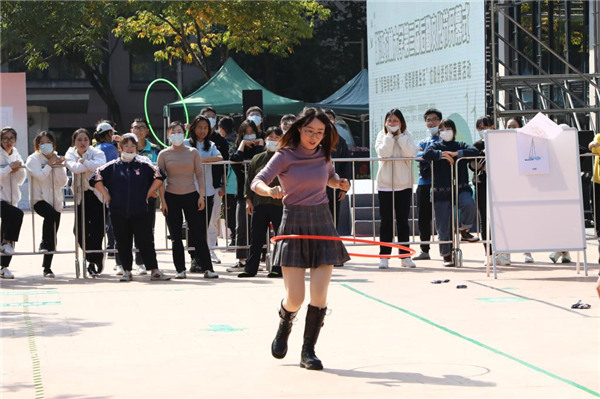 垃圾分类趣味游戏包含分类投放、呼啦圈竞走、摸石过河、背靠背夹气球等四个小项目,各参赛队以抽签的形式决定出场顺序,用时最少的队伍获胜。游戏场上,选手们各显神通、争分夺秒,每一参赛小组都力争最快到达终点,敲响胜利的锣鼓。