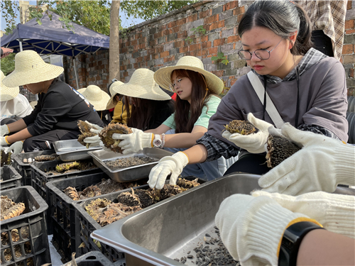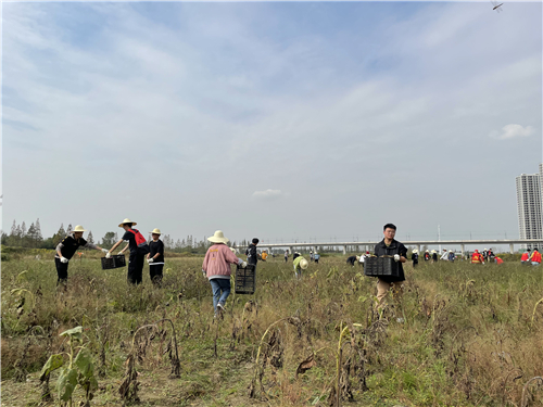 10月28日下午,浙江财经大学东方学院后勤基建部党支部联合机关党总支、工商管理学院、浙江省农业科学院科研基地管理部和长安镇新民村在大学生劳动实践教育基地开展农耕体验活动——向日葵采摘和搓花盘。