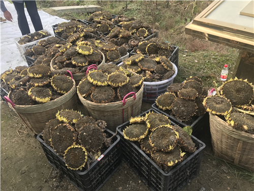 搓瓜子队的队员也进行了简单的分工,有的搓瓜子、有的筛杂物、有的打包装袋。有的人员席地而坐,一边搓瓜子一边交流心得,讨论哪种方法搓得最快最干净,哪种方法……还有的人员将搓下来的瓜子用竹筛子筛去杂质、枯叶和还未褪干净的管状花并打包装好。大家分工协作,有条不紊,没多久箩筐里满满的都是一个多小时的劳动成果。活动结束后大家一起合照留念,记录这次美好的农耕劳作之旅。