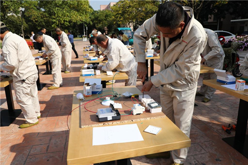 电工岗位技能比赛项目为电表、灯(包括漏保、插座、开关)的安装,水电修建中心15名员工参加比赛。赛场上,参赛选手聚精会神,有条不紊,充分展示自身的电工技艺。水电专家陆金林评委对各参赛选手的表现作了专业点评。