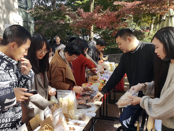活动现场,人头攒动,气氛热烈。来自省内外地区的常山山茶油、龙游发糕、新疆阿克苏苹果、四川橄榄油、甘肃牛肉干等的特色帮扶产品吸引了大批师生前来选购。一天的时间里,总共售卖了33000元左右的产品。