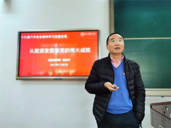 谢继华以《从脱贫攻坚看党的伟大成就》为题,围绕党的十八大以来脱贫攻坚战的回顾、电子科技大学在贵州岑巩县定点帮扶工作主要介绍、巩固脱贫攻坚成果与有效衔接乡村振兴的感悟思考等几个方面,为全体党员上了一堂精彩的十九届六中全会精神学习专题党课,带领大家再次重温了习近平总书记关于脱贫攻坚工作的讲话精神,学习了《中共中央关于党的百年奋斗重大成就和历史经验的决议》中脱贫攻坚成就的表述,了解电子科技大学校定点扶贫工作开展情况。