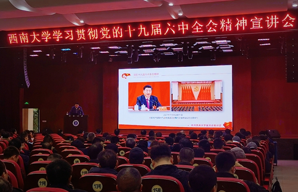 12月17日上午,西南大学后勤保障部党委学习贯彻党的十九届六中全会精神宣讲会在学生处107会议室举行。校党委委员、党委宣传部副部长、出版社与期刊社党委书记杨毅作主题报告,近400名教职工参会。宣讲会由后勤保障部党委书记李建光主持。