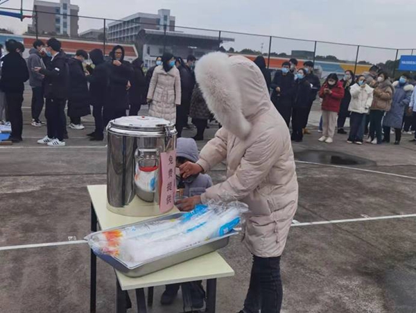 哪里有人,哪里就有暖暖的红糖姜茶,前来排队做核酸检测的师生们,一杯红糖姜茶在手,塑造出一道靓丽的风景线,信息学院的老师们赞不绝口,为这“红糖姜茶”竖起大拇指。