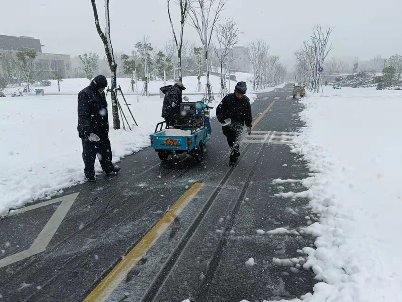 上午8点,校园一片静谧,鹅毛大雪洋洋洒洒,后勤人行动起来,启动寒假极端天气应急预案,在后勤集团统筹下,物业中心、饮服中心会同华舟物业公司紧急调动组织了两校区120余名管理骨干、保洁人员,以校园主干道、食堂和宿舍之间、办公楼教学楼周边为重点,利用铲雪锹、扫帚等扫雪工具清理路面积雪、楼宇入口台阶,铺设草垫,并在校园主要道路上撒布了融雪盐。大家通力合作、不畏严寒,经过4个小时的奋战,校园内主要区域全部清理完毕,保证了留校师生员工的出行安全。