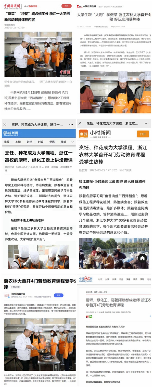 相关媒体纷纷以“浙农林大首开4门劳动教育课程受学生热捧”“厨师、绿化工、寝管阿姨都成老师 浙江农林大学首开4门劳动教育课程”“‘烧菜’‘种花’成必修学分 浙江一大学创新劳动教育课程内容”“大学生跟‘大厨’学做菜”“烹饪、种花成为大学课程,浙江农林大学首开4门劳动教育课程受学生热捧”“烹饪、种花成为大学课程,浙江一高校的厨师、绿化工走上讲坛授课”为题,报道我校劳动教育课程。