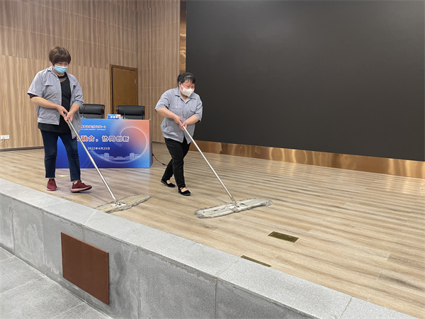针对此次会议要求以及当前疫情防控形势,物业服务部严格落实“人、物、环境”同防的工作要求,率先做好会场消杀工作,对会议现场的桌椅进行了全面消杀和清理,进一步将疫情防控消杀措施做实做细;认真做好会议现场的保洁、布置等工作,保洁员对会场内外的地面、卫生间,会议现场的舞台、墙面、地毯、座椅、扶手等场所清扫地一尘不染;在充分考虑实际需求和简洁简约的前提下,会议现场花卉绿植的外围摆放基调以庄重、大气、整洁为主,采用外高中低的整体布局,提升了会议的热烈氛围;此外,现场会务人员提前测试会议设备、多次演练多媒体操作流程,以确保整场论坛的高效有序运转。