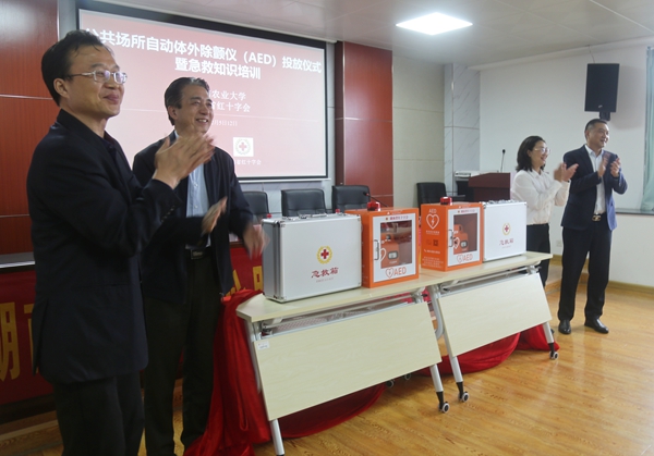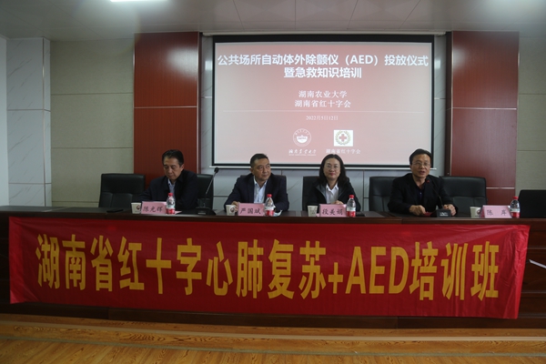 5月12日是我国第14个防灾减灾日。当天下午,湖南省红十字会在湖南农业大学举办自动体外除颤仪(AED)投放仪式暨急救知识培训活动。省红十字会党组成员、秘书长严国斌,省红十字会赈济救护部部长侯隽,赈济救护部四级调研员李海林,学校党委副书记段美娟,副校长陈光辉,校医院等相关部门负责人与工作人员,以及50多名学生参加活动。活动由后勤保障中心党委书记陈岸主持。